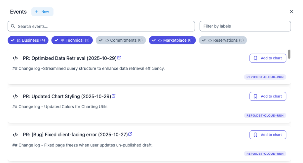 Often the root cause is known — a deployment, new region, or event like Black Friday — but there’s no structured correlation between these events and the cost data.
